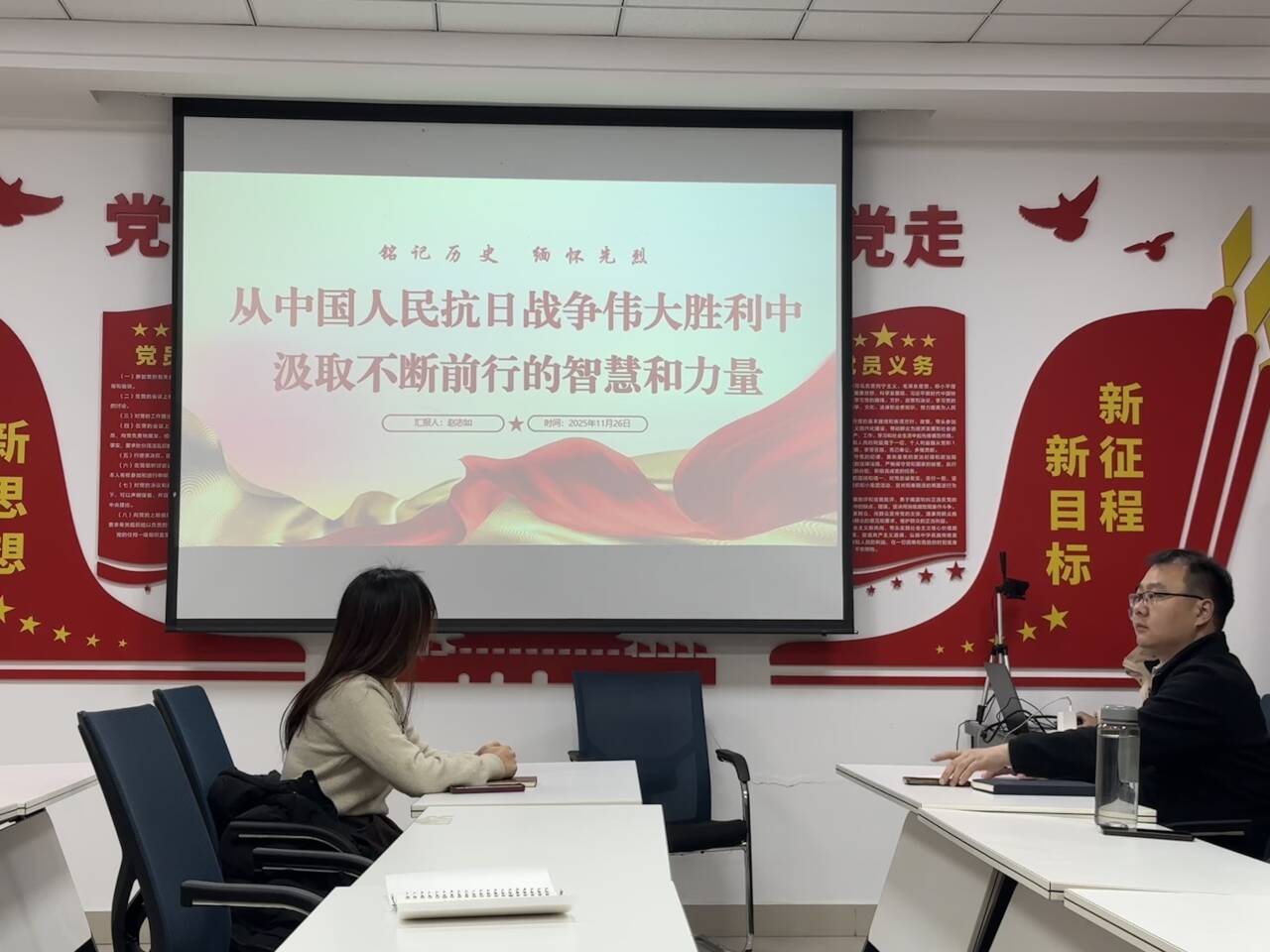 在专题学习环节,支部成员赵志如同志带领全体参会人员重温中国人民抗日战争的壮阔历程,回顾了从九一八事变到抗日战争胜利的十四年艰苦卓绝的伟大斗争,强调了天下兴亡、匹夫有责的爱国情怀,视死如归、宁死不屈的民族气节,不畏强暴、血战到底的英雄气概,以及百折不挠、坚韧不拔的必胜信念。习近平总书记在纪念中国人民抗日战争暨世界反法西斯战争胜利80周年大会上发表重要讲话强调,新时代新征程,要“传承和弘扬伟大抗战精神,踔厉奋发、勇毅前行,为以中国式现代化全面推进强国建设、民族复兴伟业而团结奋斗”。在新时代背景下,党员同志应该深刻铭记抗战胜利的历史意义,从历史中汲取“坚持党的全面领导”的根本遵循,坚定中国特色社会主义道路自信、理论自信、制度自信、文化自信,始终以人民为中心,将抗战精神转化为立足岗位、履职尽责的实际行动。