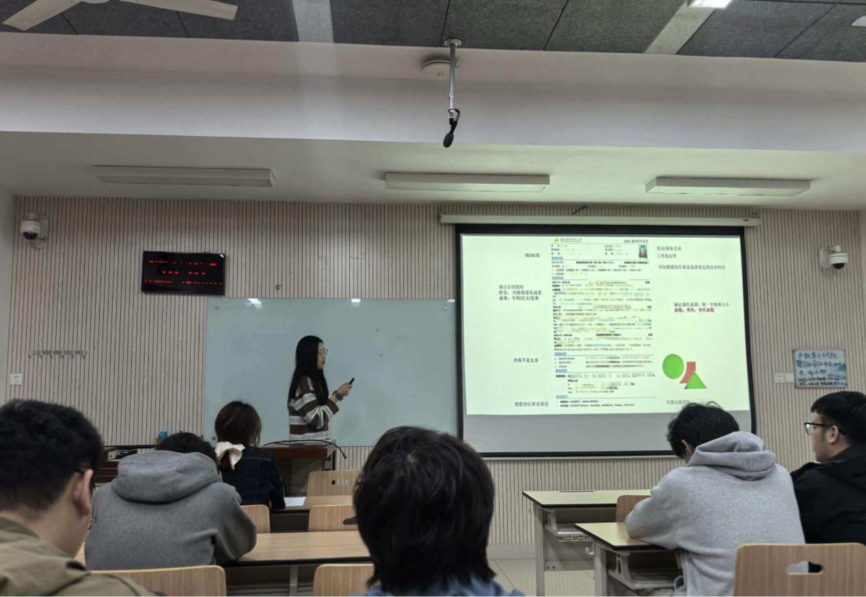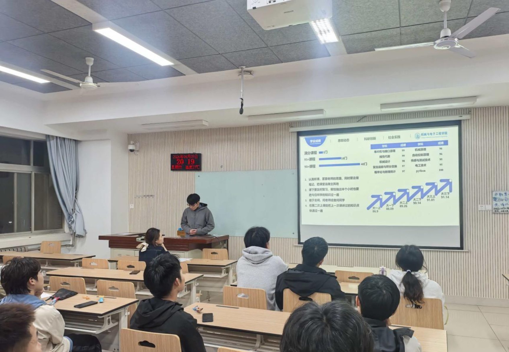 分享过程中,三位分享人真诚真挚、干货满满。针对保研相关问题,分享人详细讲解了保研流程、准备要点、院校选择及复习技巧,结合自身保研经历,叮嘱同学们注重专业成绩提升、科研能力积累,合理规划备考时间;在就业分享环节,分享人结合当前就业形势,分析了机电和智能装备工程专业的就业方向、岗位需求,分享了简历制作、面试技巧等实用方法,鼓励同学们树立正确的就业观,提前做好职业规划,提升自身竞争力;关于学习方法,分享人结合专业学习特点,分享了课堂高效听课、课后复习巩固、专业知识拓展的技巧,建议同学们合理分配时间,杜绝拖延,养成良好的学习习惯;在生活规划和朋辈帮扶方面,分享人结合自身经历,鼓励同学们平衡学习与生活,积极参与集体活动,主动寻求帮助、乐于伸出援手,在互助共进中收获成长。