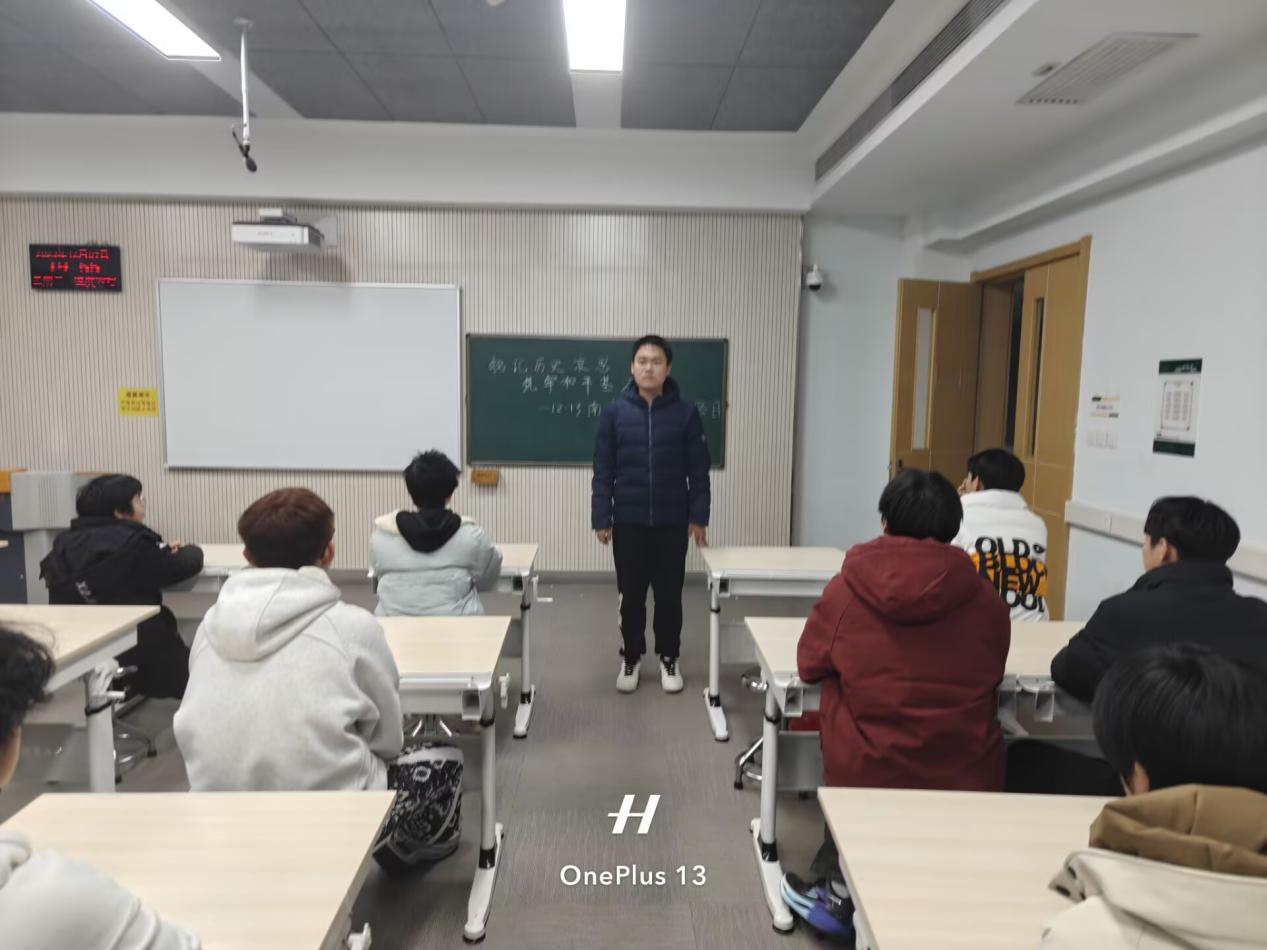 活动开篇,全体同学起立默哀一分钟,伴随着低沉肃穆的背景音乐,大家神情凝重,以庄重的姿态缅怀80余年前在南京大屠杀中遇难的无辜同胞,寄托深切哀思。默哀结束后,负责人以“历史真相与和平使命”为核心,结合详实的历史史料、影像资料与文献记载,系统梳理南京大屠杀的历史脉络,重点讲解遇难同胞的惨痛遭遇、革命先烈的抗争事迹,深刻阐释设立国家公祭日的历史意义与时代价值,强调“铭记历史不是延续仇恨,而是以史为鉴守护和平”,呼吁同学们从历史中汲取奋进力量,扛起青年一代的责任担当。随后,班级宣传委员带领大家学习习近平总书记关于历史记忆与和平建设的重要论述,结合当代青年成长实际,解读“以史为鉴、开创未来”的实践要求,进一步夯实同学们的历史认知与理论基础。