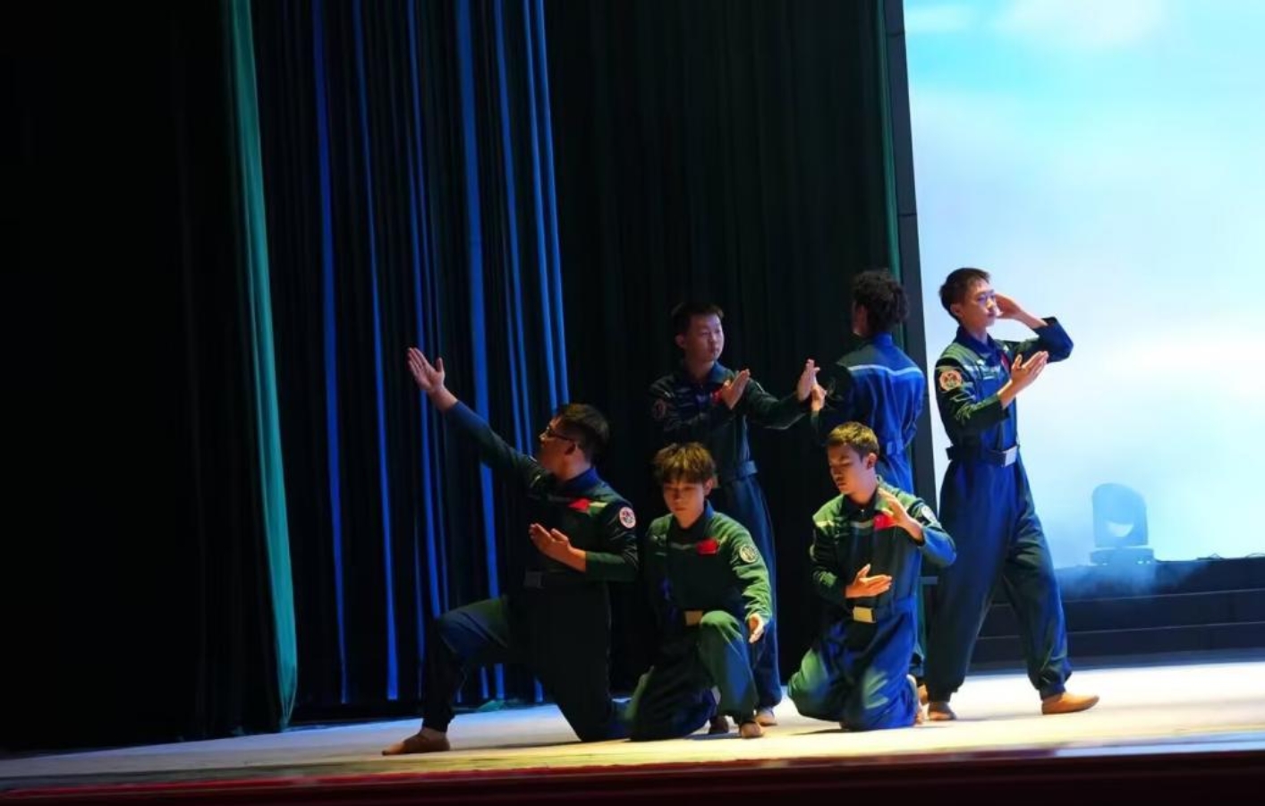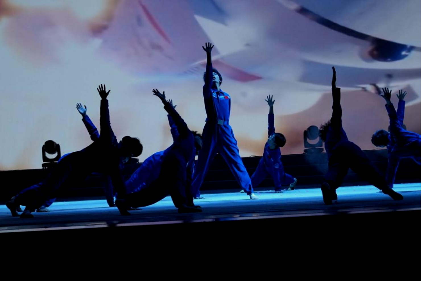 《星火永相传》由机电学院部分男生联袂演绎,舞者们身着纯蓝色的航天主题演出服,以刚劲有力的肢体动作、层次丰富的队形变换,将中国航天从筚路蓝缕的创业之初,到星辰大海的探索征程生动呈现。从“两弹一星”的攻坚克难,到载人航天、月球探测、火星探测的接连突破,每一个舞蹈动作都紧扣航天发展的关键节点,伸展的手臂似托举航天梦飞向苍穹,俯身的姿态如扎根科研攻坚克难,展现出航天人不畏艰险、勇攀高峰的精神