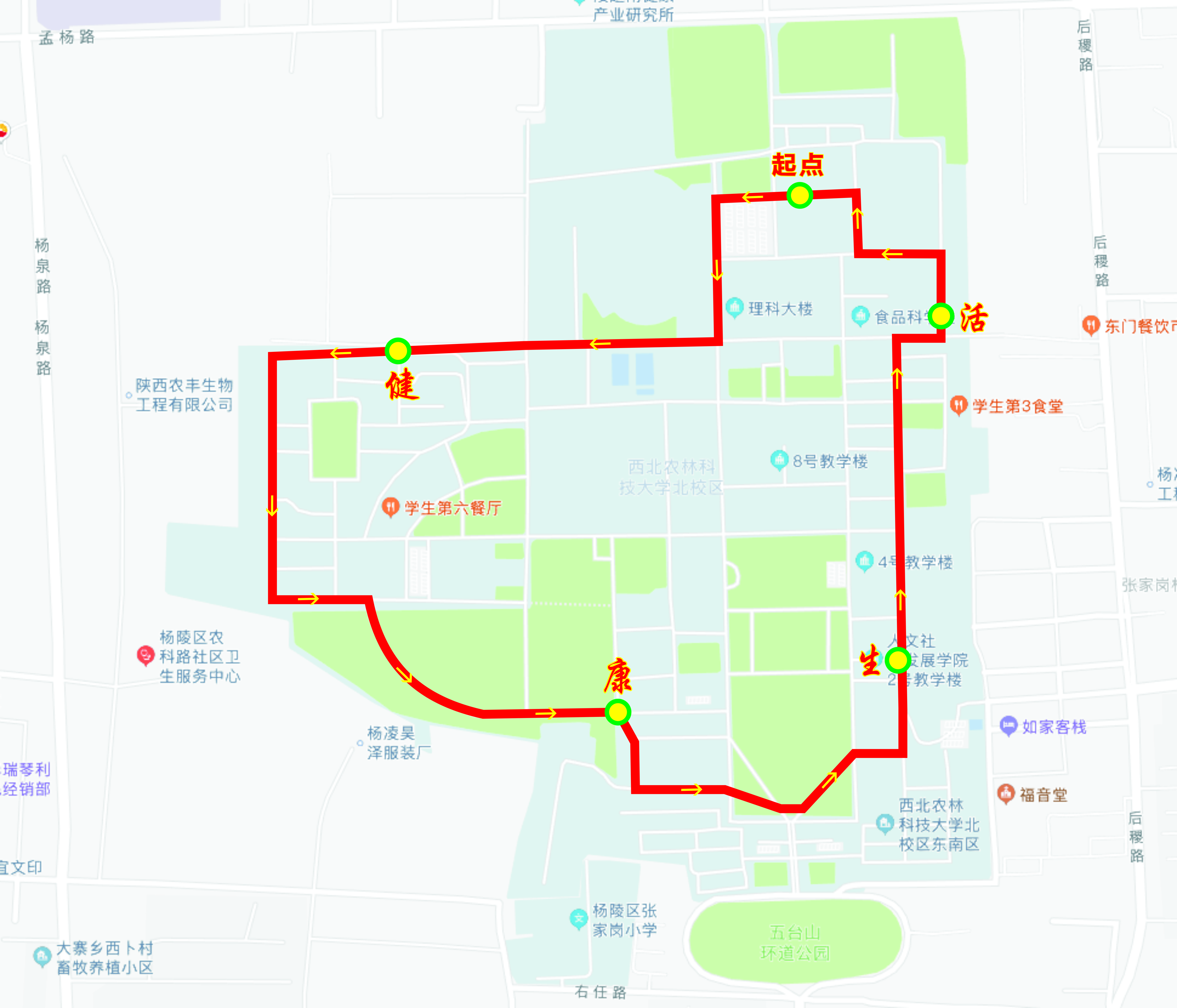 4.步行路线:从学院办公楼出发,经学生西区6号宿舍后,到西区澡堂,随后经过亦乐园,到达人文学院,最后经过食品学院楼后返回学院。